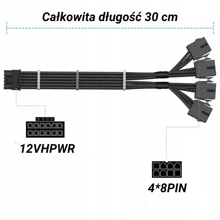 Elastyczna przejściówka w oplocie została wykonana z grubego przewodu 16 AWG co umożliwia bezpieczne zasilanie wydajnych kart graficznych, w zestawie dołączone są 3 grzebienie do estetycznego ułożenia kabli. Adapter kompatybilny jest z wszystkimi kartami ze złączami 12VHPWR
