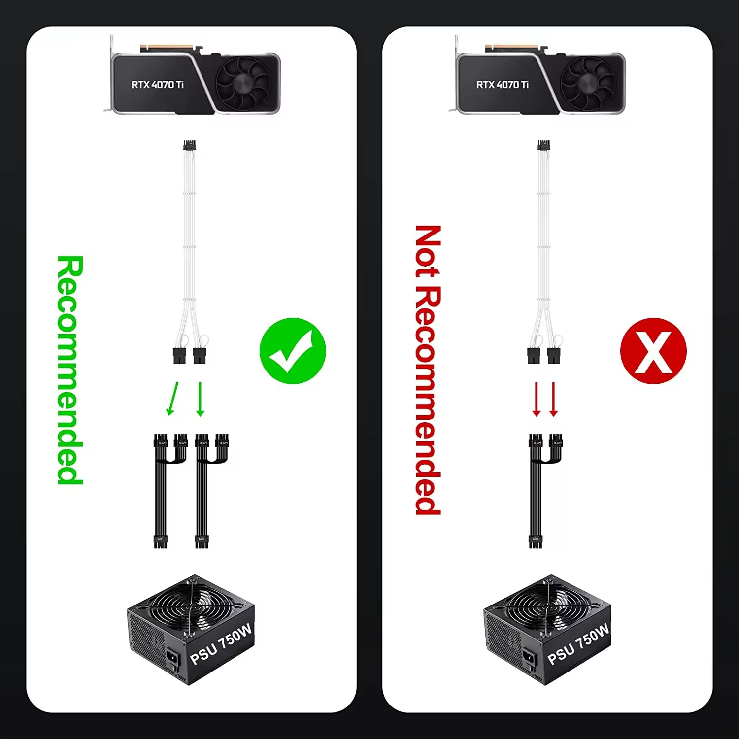 Elastyczna przejściówka w oplocie została wykonana z grubego przewodu 16 AWG co umożliwia bezpieczne zasilanie wydajnych kart graficznych, w zestawie dołączone są 3 grzebienie do estetycznego ułożenia kabli. Adapter kompatybilny jest z wszystkimi kartami ze złączami 12VHPWR lecz zaleca się używać go na kartach RTX 4070 Ti