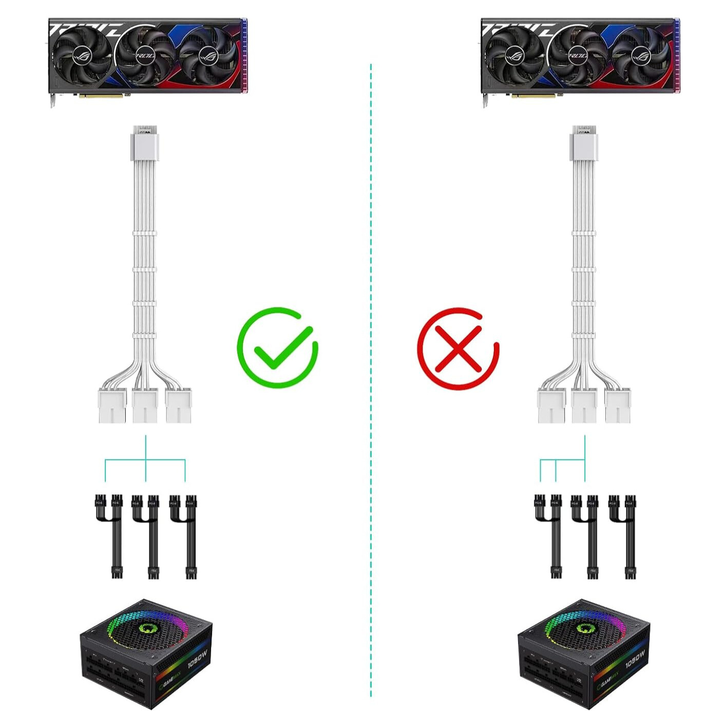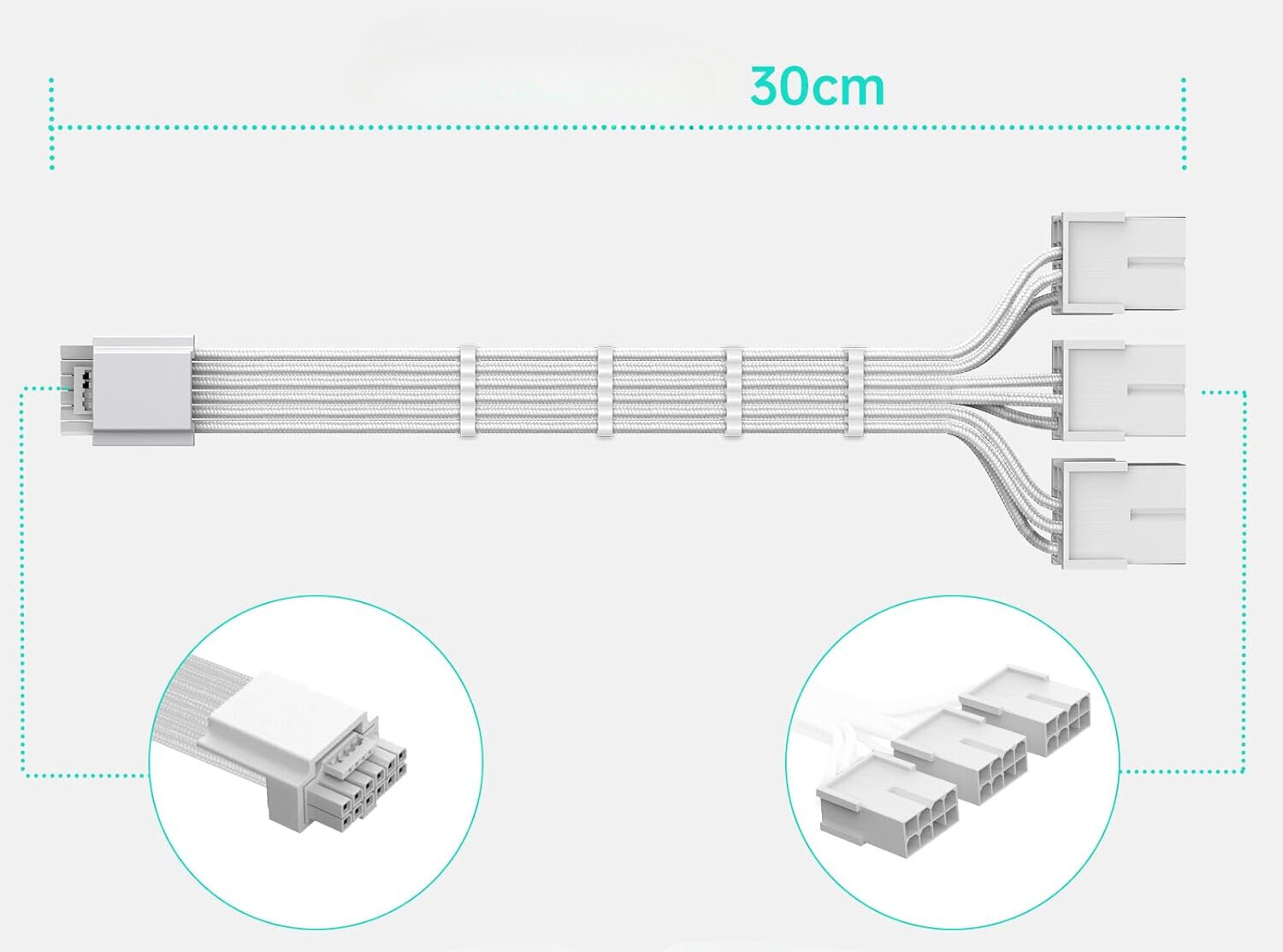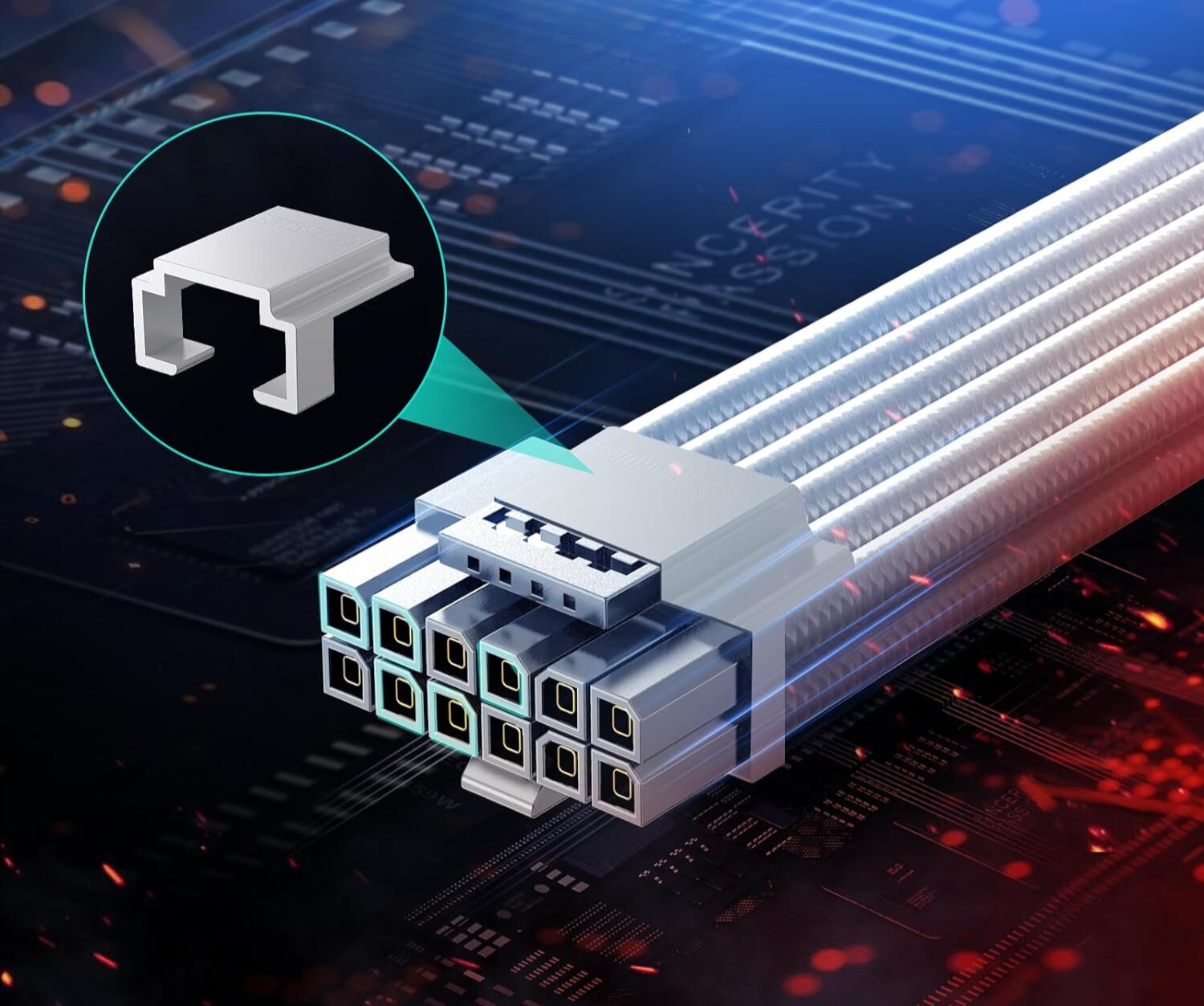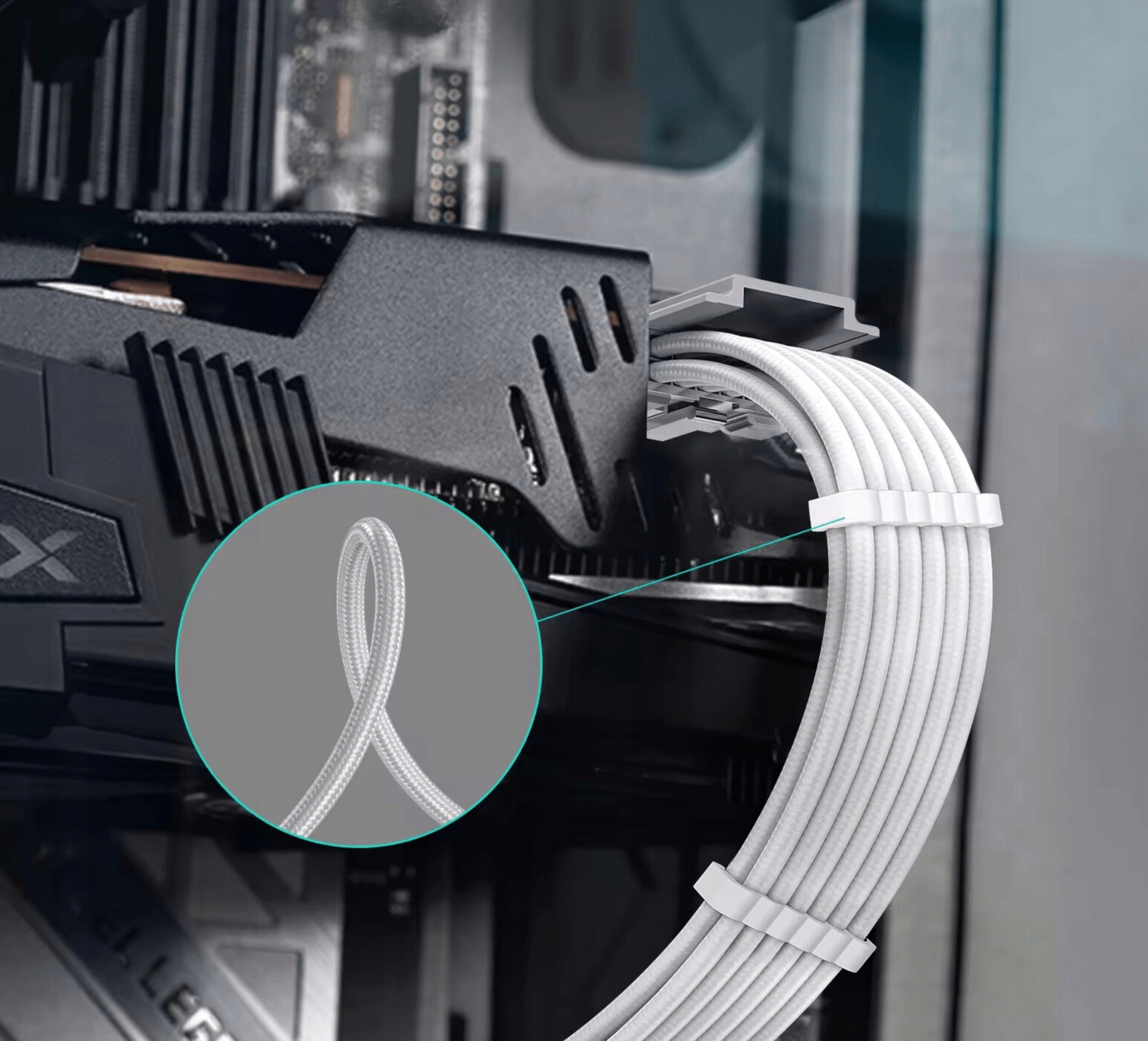 Elastyczna przejściówka w oplocie została wykonana z grubego przewodu 16 AWG co umożliwia bezpieczne zasilanie wydajnych kart graficznych, w zestawie dołączone są 3 grzebienie do estetycznego ułożenia kabli oraz radiator chłodzący złącze 12VHPWR zapobiegający przegrzewaniu złącz. Adapter kompatybilny jest ze wszystkimi kartami ze złączami 12VHPWR