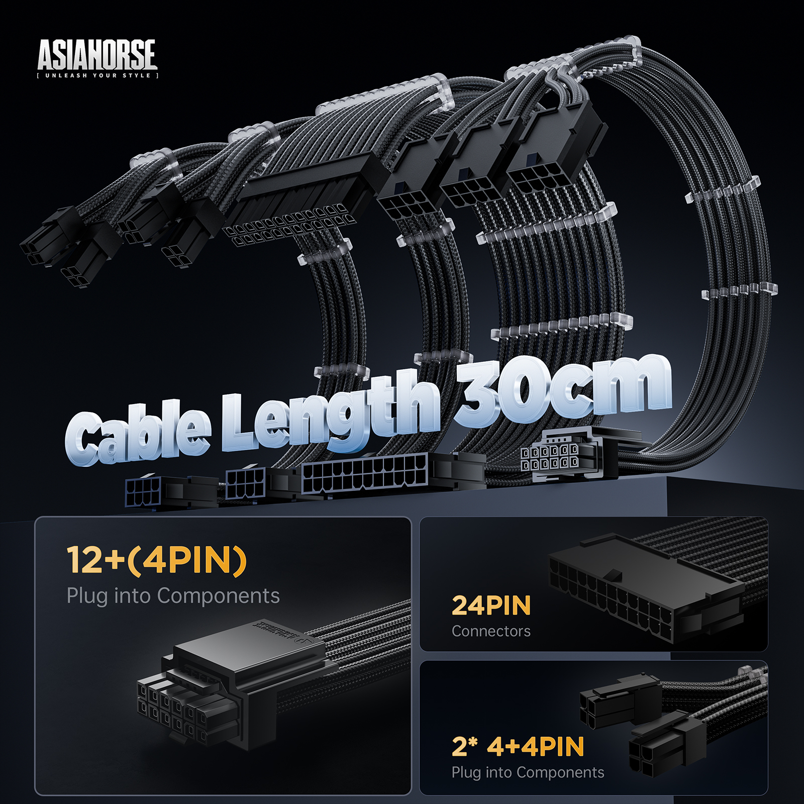 Zestaw przedłużaczy kabli zasilających Asiahorse to idealny produkt aby poprawić estetyke i wydajność swojego komputera stacjonarnego. Przewody wykonane są z plecionki nylonowej, co sprawia, że są wyjątkowo miękkie i łatwe w montażu. Dzięki czemu można je łatwo układać, nawet w ciasnych miejscach. Każdy przedłużacz posiada 4 grzebienie, które ułatwiają ułożenie przewodów w odpowiednim kształcie.