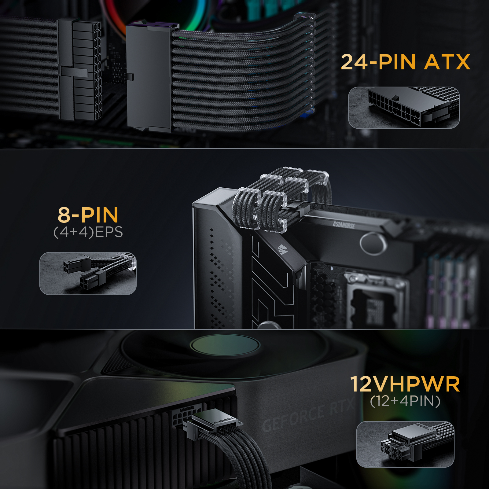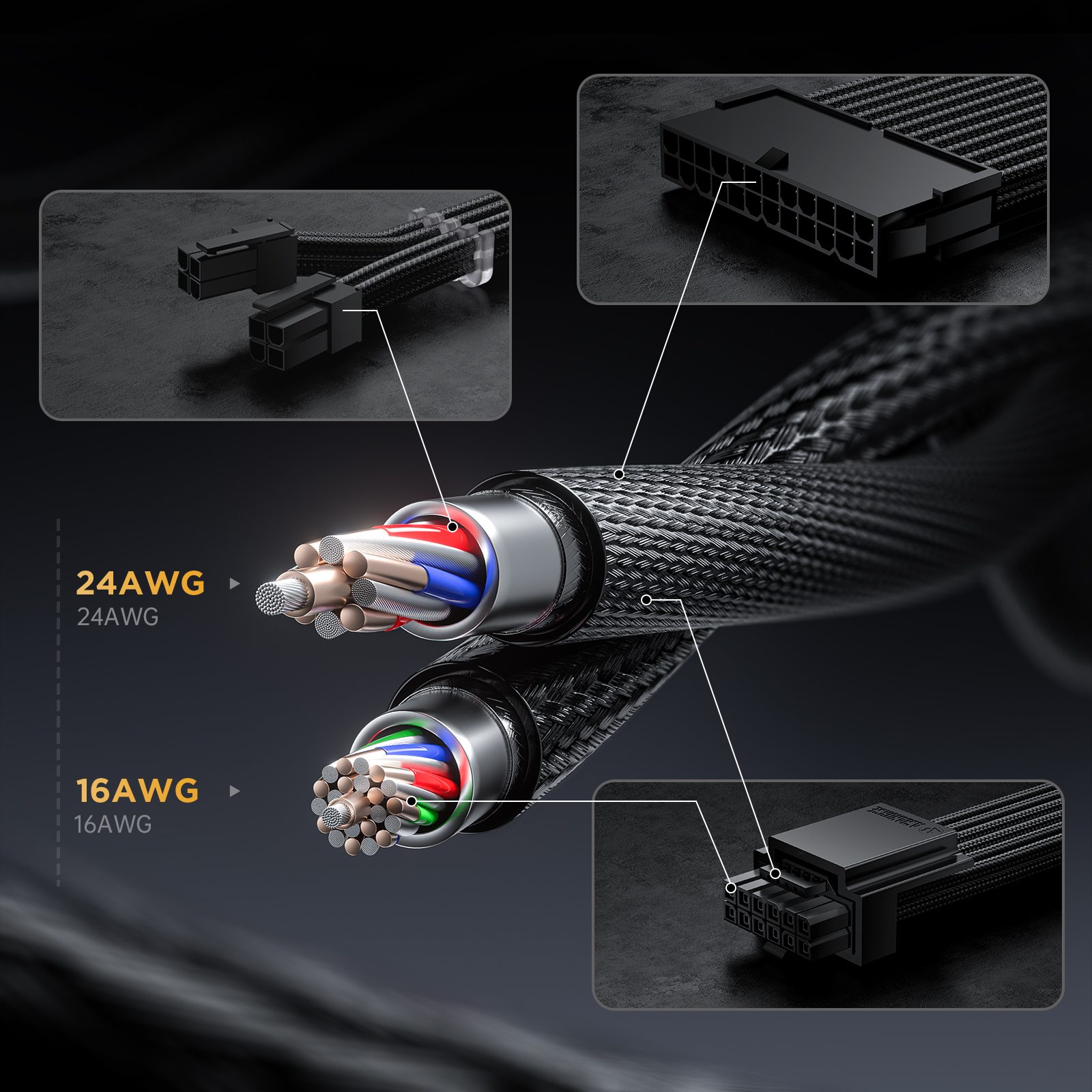 Przedłużacze wykonane są z wysokiej jakości materiałów, które zapewniają stabilną prace i długą żywotność. Przewody wykonane są z miedźi cynowanej UL1015 16AWG , która jest bardzo wytrzymała i odporna na wysoką temperaturę. Przewody są kompatybilne ze wszystkimi zasilaczami, takimi jak serie RM, RMX RM550x, RM650x, RM750x, RM850x, RM1000x, HX1000, Corsair CX, itp.