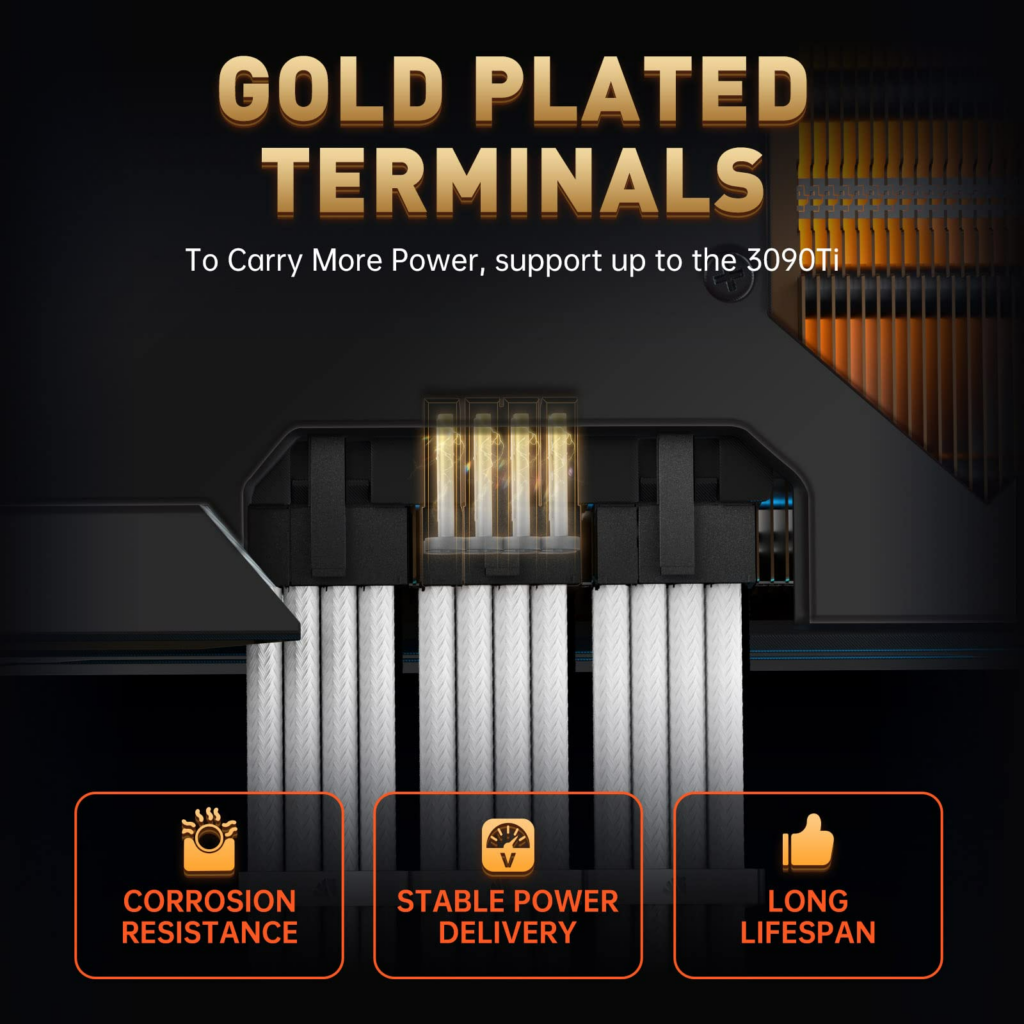 Przedłużacze wykonane są z wysokiej jakości materiałów, które zapewniają stabilną pracę i długą żywotność. Przewody wykonane są z miedźi cynowanej UL1015 16AWG, która jest bardzo wytrzymała i odporna na wysoką temperaturę. Przewody są kompatybilne ze wszystkimi zasilaczami, takimi jak serie RM, RMX, RM550x, RM650x, RM750x, RM850x, RM1000x, HX1000, Corsair CX, itp.