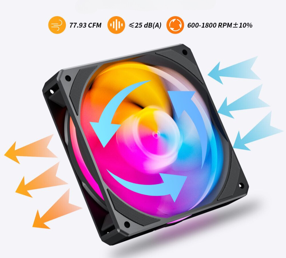 Zestaw Wentylatorów UpHere U2C 120mm ARGB charakteryzuje się pięcioma łopatkami, które gwarantują doskonały przepływ powietrza. Dzięki maksymalnemu przepływowi powietrza wynoszącemu aż 78 CFM, nawet najbardziej wymagające podzespoły mogą być skutecznie chłodzone. Łopatki wentylatora wykonane są z wysokiej jakości materiałów, co zapewnia cichą i wydajną pracę. Dodatkowo, wentylatory posiadają podświetlenie ARGB, które można kontrolować za pomocą dedykowanego oprogramowania lub bezpośrednio z poziomu płyty głównej.