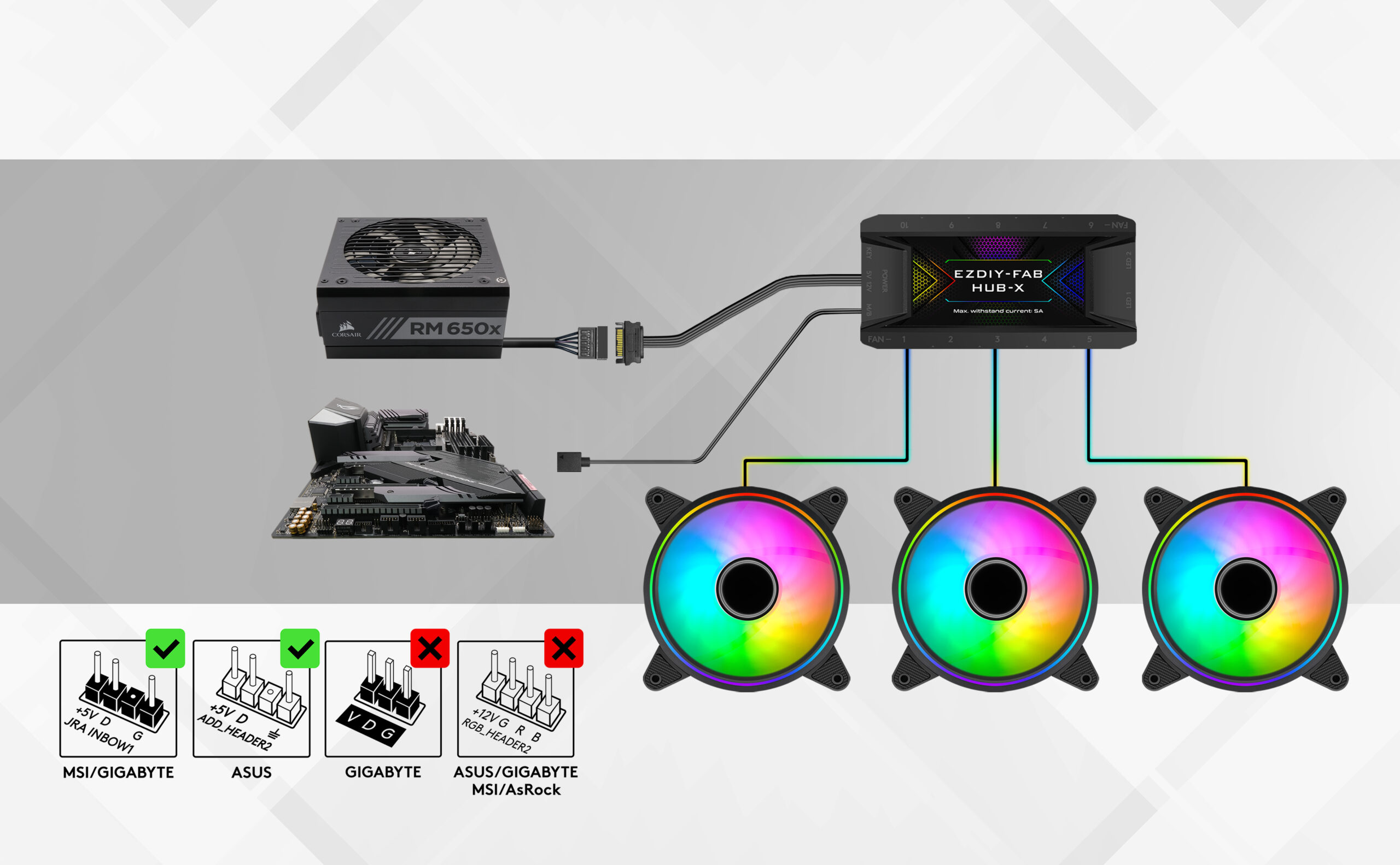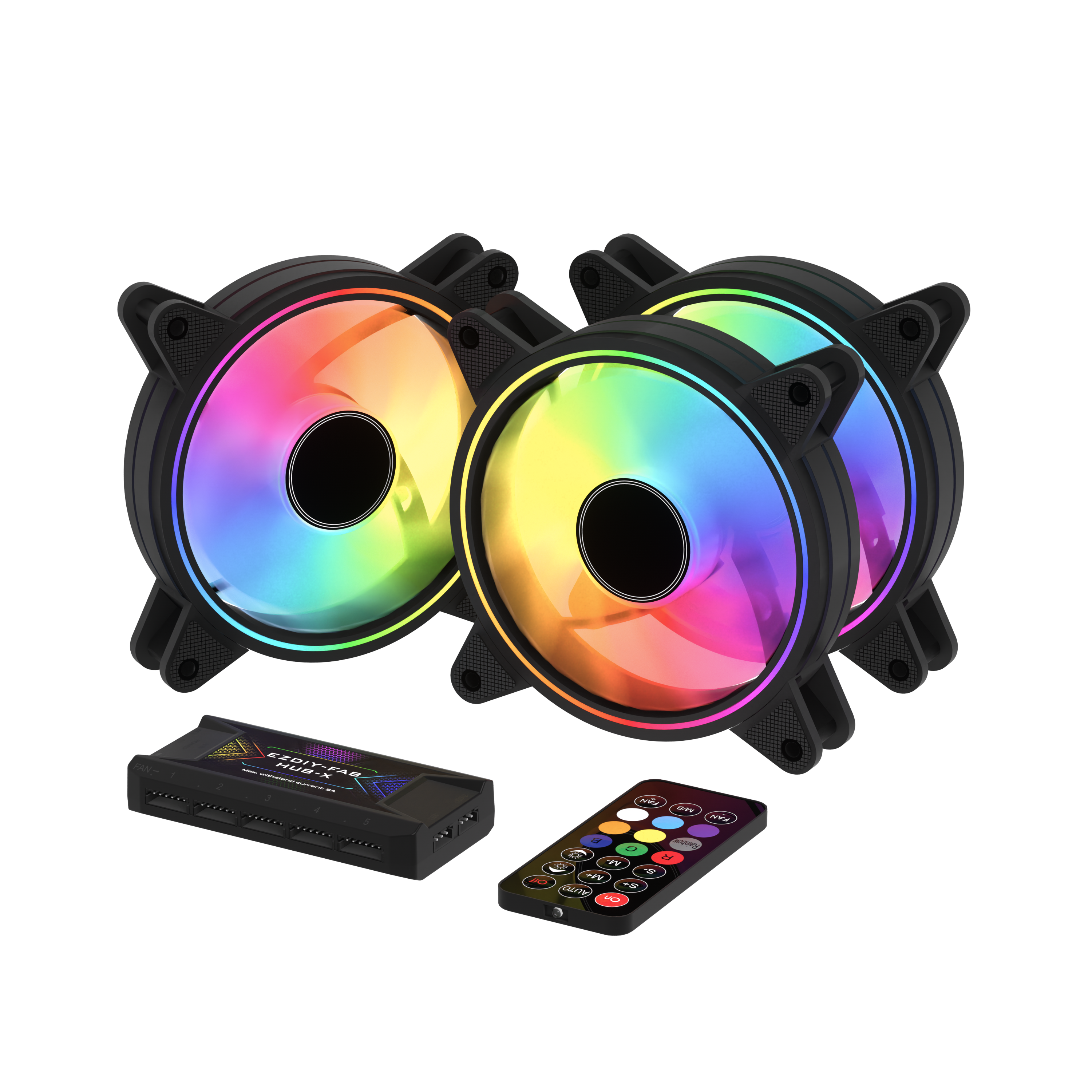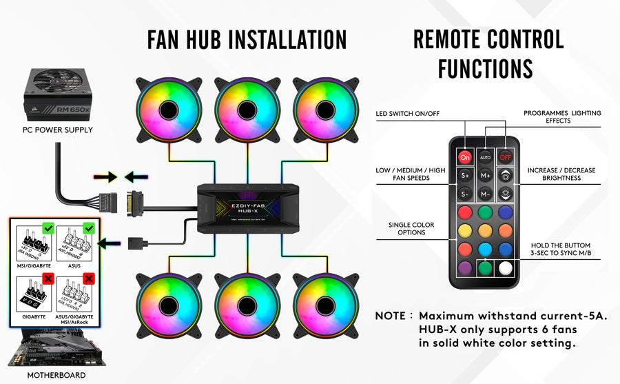Jeśli komputer posiada złącze ARGB na płycie głównej można sterować do woli podświetleniem wentylatorów przez program od producenta płyty głównej, natomiast jeśli komputer nie posiada takiego złącza można sterować wentylatorami za pomocą pilota dołączonego do zestawu
