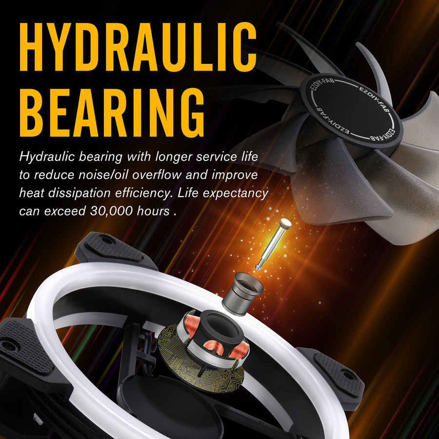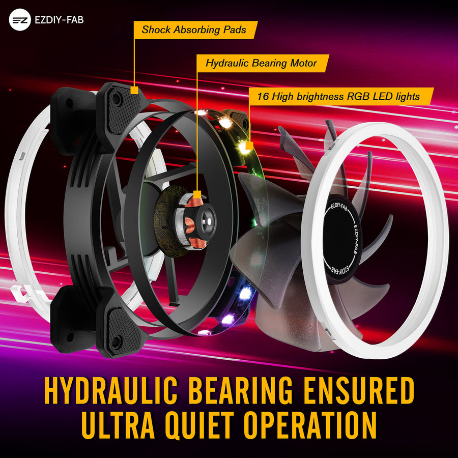 Wentylatory EZDIY Dual Ring zapewniają cichą i wydajną pracę dzięki wysokiej jakości łopatkom oraz gumowym podkładkom, które redukują wibracje. Maksymalny hałas wentylatora wynosi 25 dB, co oznacza, że jest praktycznie niesłyszalny w trakcie pracy.