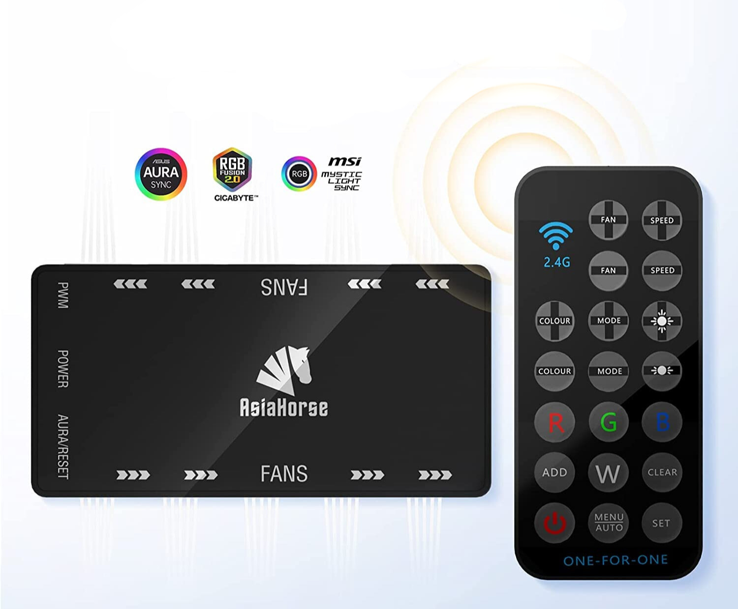 Jeśli komputer posiada złącze ARGB na płycie głównej można sterować do woli podświetleniem wentylatorów przez program od producenta płyty głównej, natomiast jeśli komputer nie posiada takiego złącza można sterować wentylatorami za pomocą pilota dołączonego do zestawu