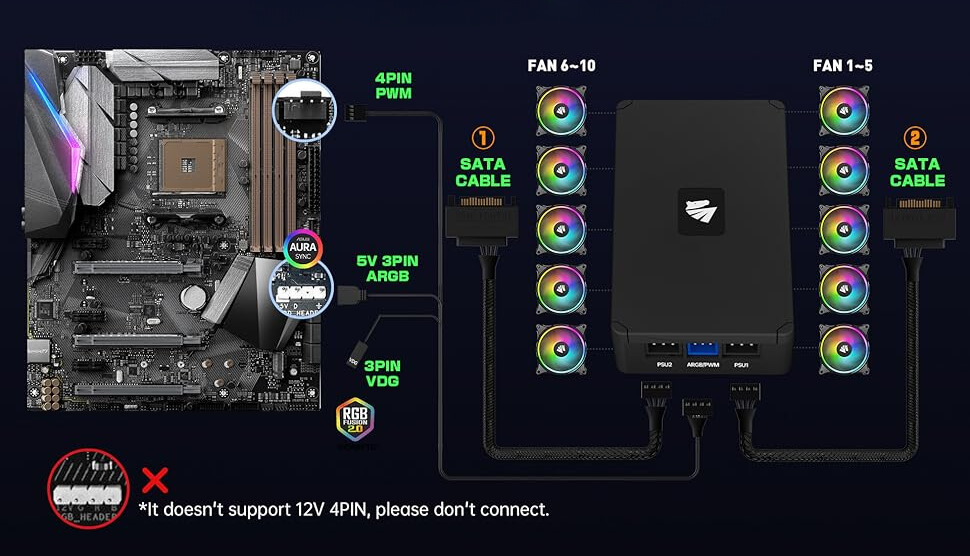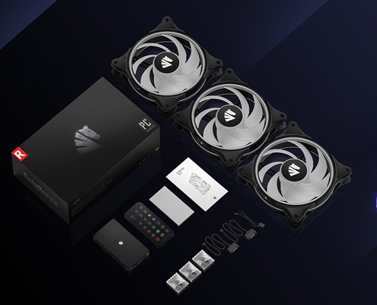 Jeśli komputer posiada złącze ARGB na płycie głównej można sterować do woli podświetleniem wentylatorów przez program od producenta płyty głównej, natomiast jeśli komputer nie posiada takiego złącza można sterować wentylatorami za pomocą pilota dołączonego do zestawu