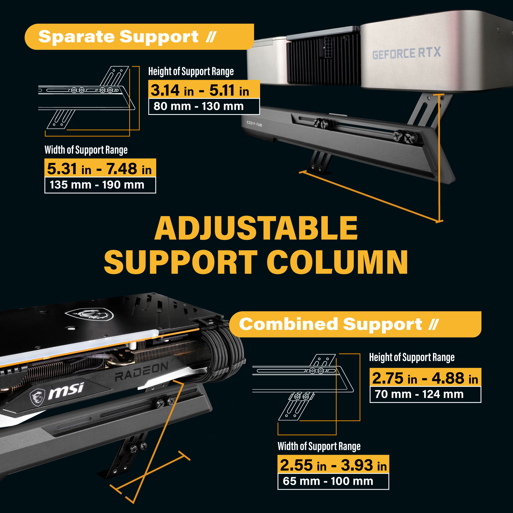 • Ruchomy wspornik o regulowanym zakresie: Wspornik podpórki można regulować co umożliwia dostosowanie podpórki do budowy każdej karty graficznej, aby zapewnić jej maksymalną stabilność.