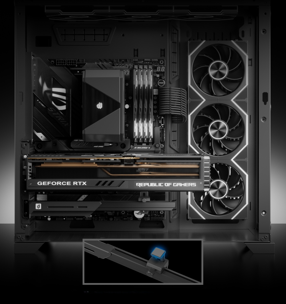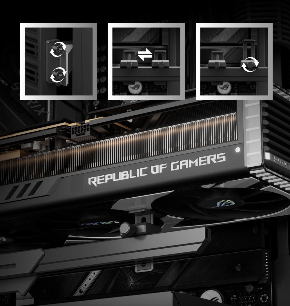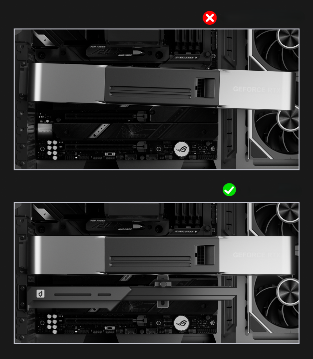 • Ruchomy wspornik o regulowanym zakresie: Wspornik podpórki można regulować co umożliwia dostosowanie podpórki do budowy karty graficznej, aby zapewnić jej maksymalną stabilność.