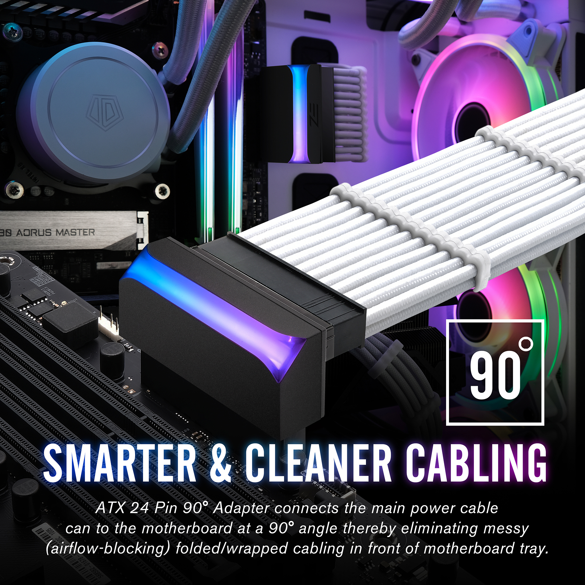 Adapter jest łatwy w montażu i demontażu. Wystarczy podłączyć go do płyty głównej i zasilacza,  Jest kompatybilny ze wszystkimi płytami głównymi z interfejsami ARGB 5V, które obsługują standardowe 24-pinowe połączenie zasilania głównego.